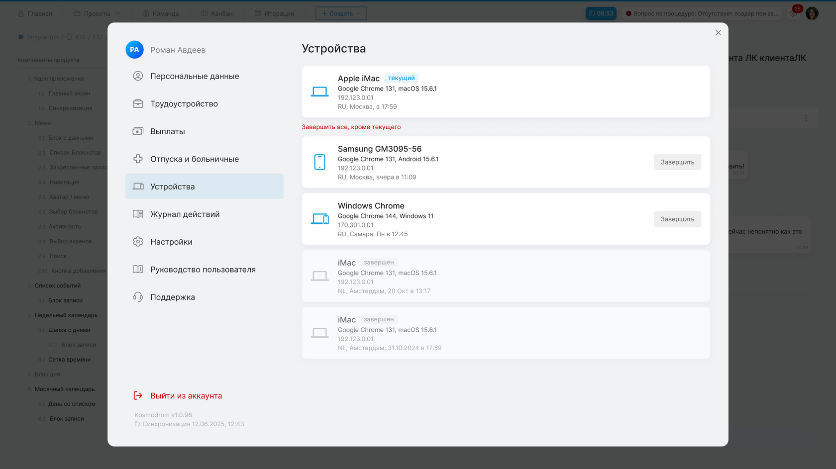 Устройство, с которого пользователь в данный момент просматривает этот раздел, помечено статусом «текущий». Завершить сессию на текущем устройстве можно только через функцию «Выйти из аккаунта».