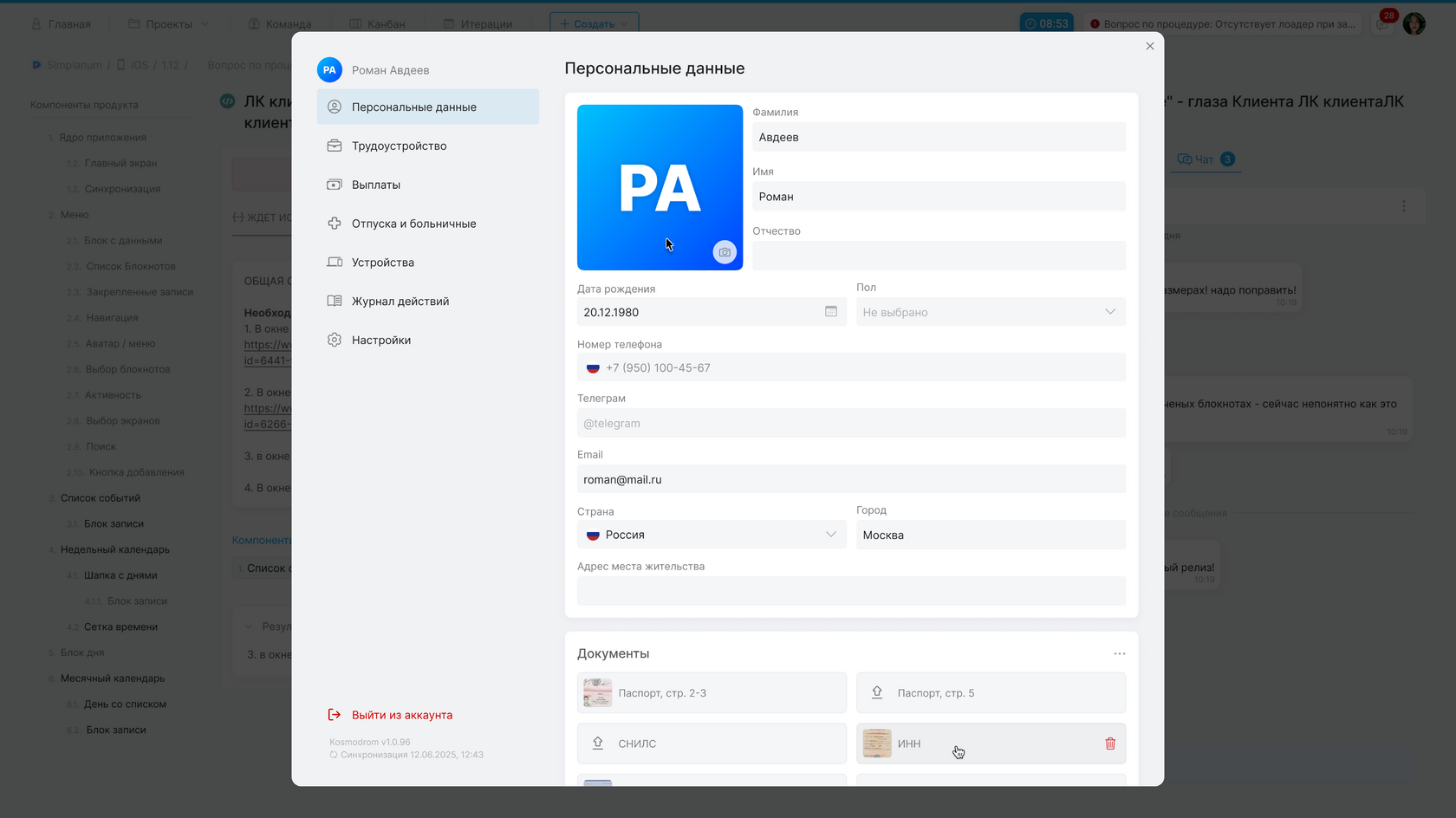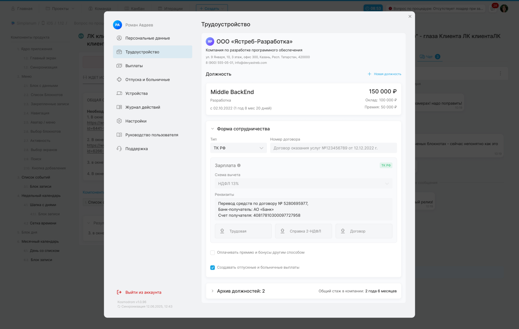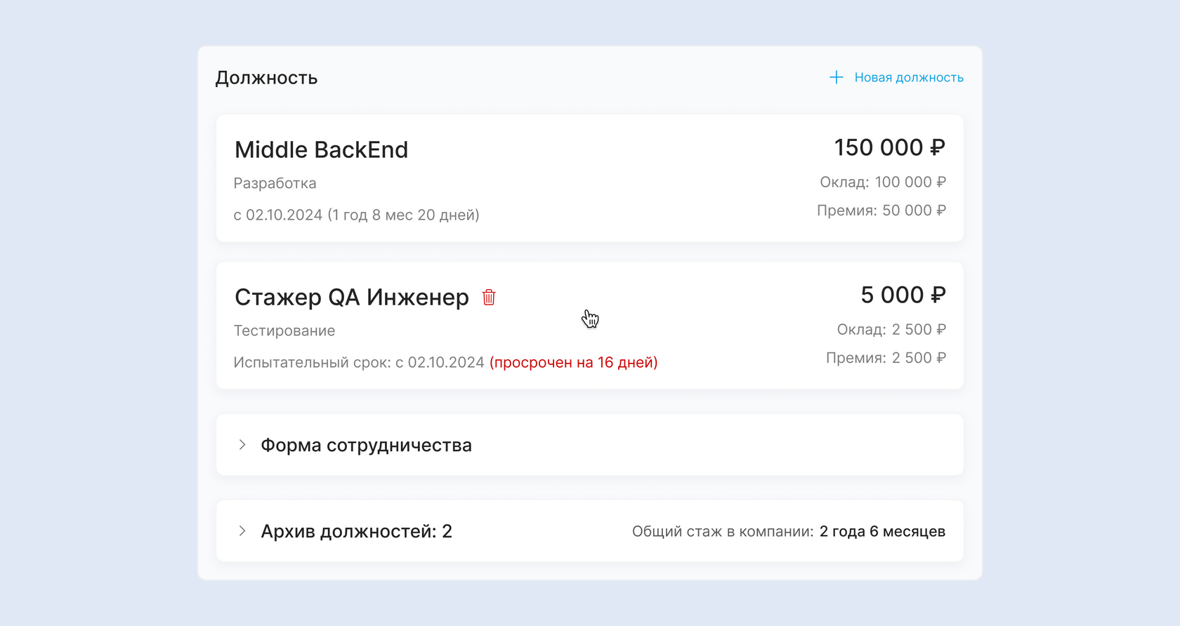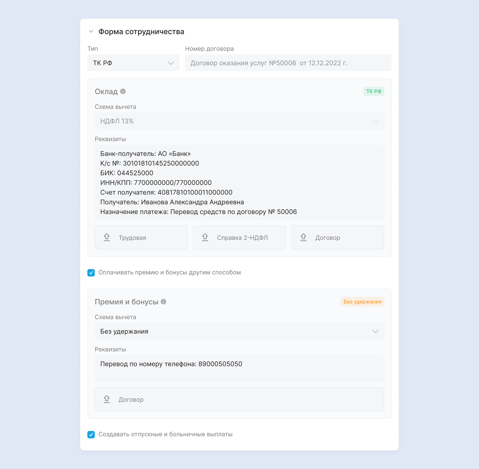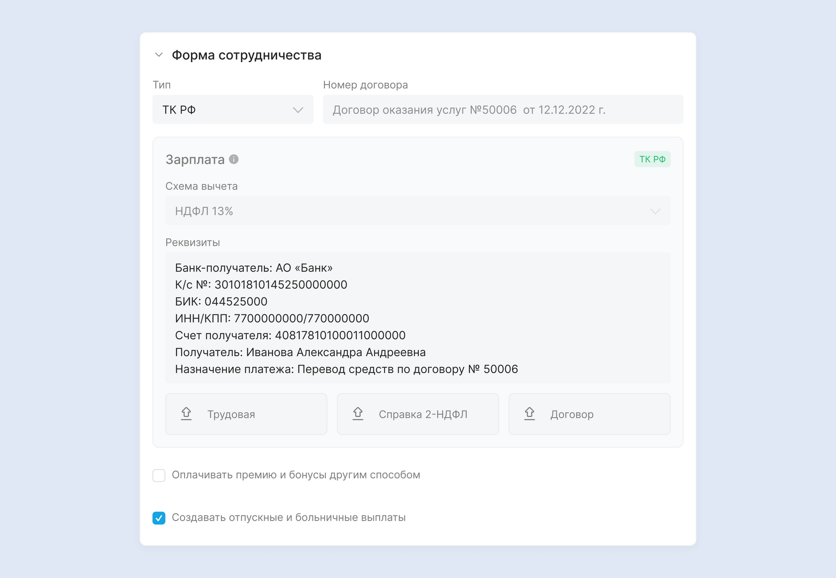 Все поля в этом блоке, кроме реквизитов, доступны для редактирования только администратору. Сотруднику они отображаются только для просмотра.