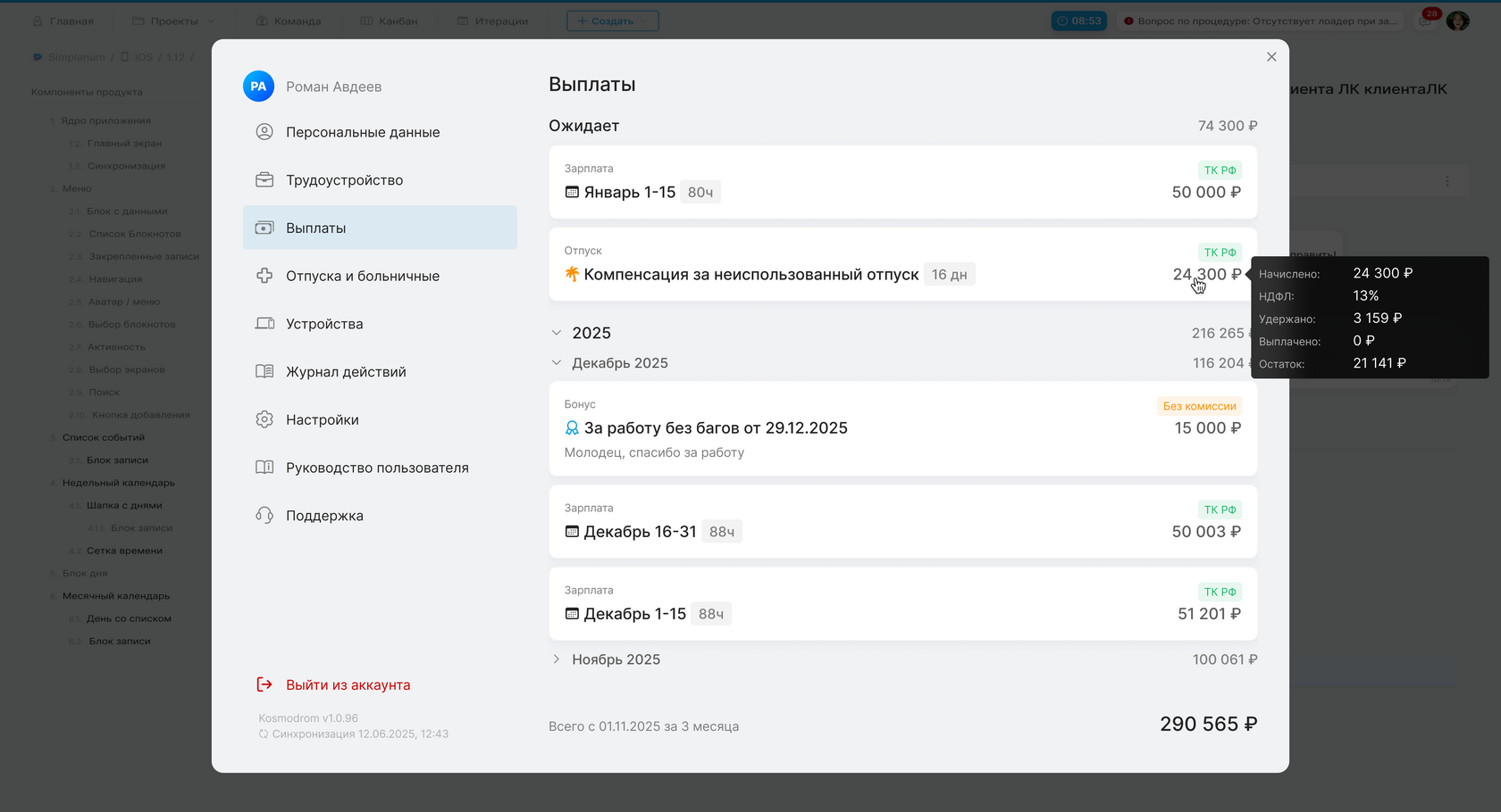 Независимо от варианта формирования выплаты, она появится в разделе «Выплаты» с типом «Отпуск» и статусом «Ожидает» за 4 дня до даты начала отпуска.